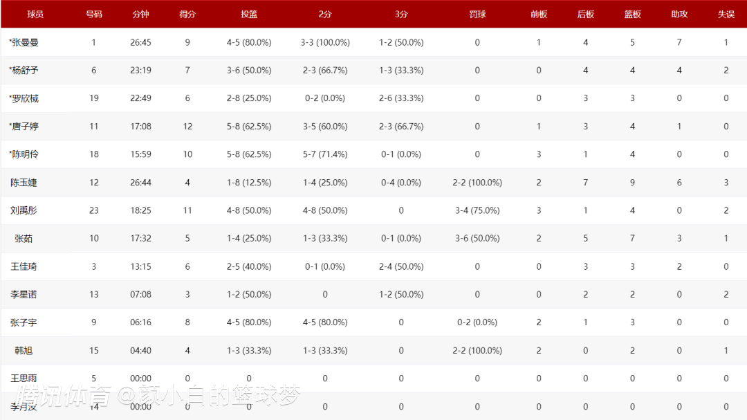 对阵捷克一战,刘禹彤是全队发挥最出色的内线,全场比赛18分钟,8中4,拿到11分4篮板,命中率50%,陈明伶10分,韩旭2分,张子宇8分。