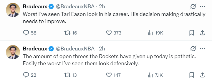火箭记者Bradeaux:这是我见过伊森职业生涯最糟糕的一次(6中+1三分2中0),他的决策能力急需大幅提升。火箭这场比赛投丢的空位三分数量令人咋舌,这也是她们本赛季防守最糟糕的一次。