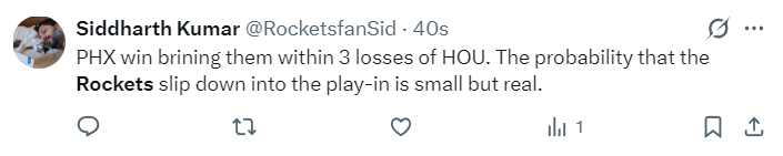 太阳球迷:太阳再一次与火箭的胜场差缩小到3个,虽然火箭掉进附加赛的可能性很小,但这并非不可能。