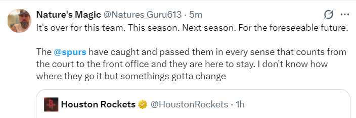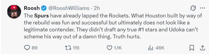 休媒:马刺已经将火箭远远甩在身后!火箭通过一些手段完成重建但看起来根本不是争冠球队,他们并没有选中一个真的核心球星,乌度卡也没有任何战术的支撑,令人痛心。