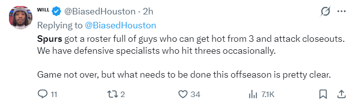 这场比赛,杜兰特33分钟,12中7,三分3中1拿到23分5篮板4助攻2盖帽;阿门36分钟,15中8拿到23分7篮板6助攻1抢断,火箭就两人20+而马刺四人20+,这样的比赛还怎么打?