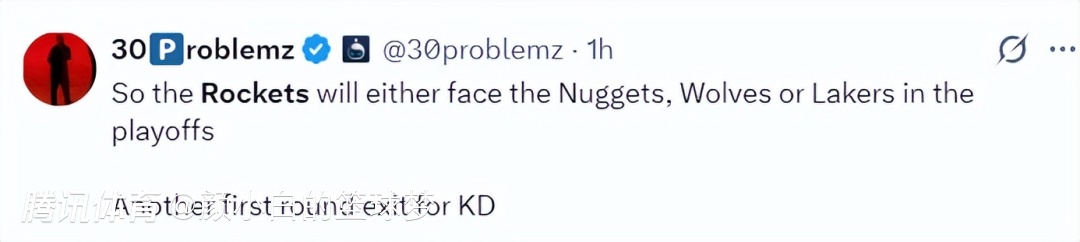 美媒:在季后赛首轮,火箭大概率要对阵掘金、森林狼、湖人,能预想到杜兰特又要首轮游了。