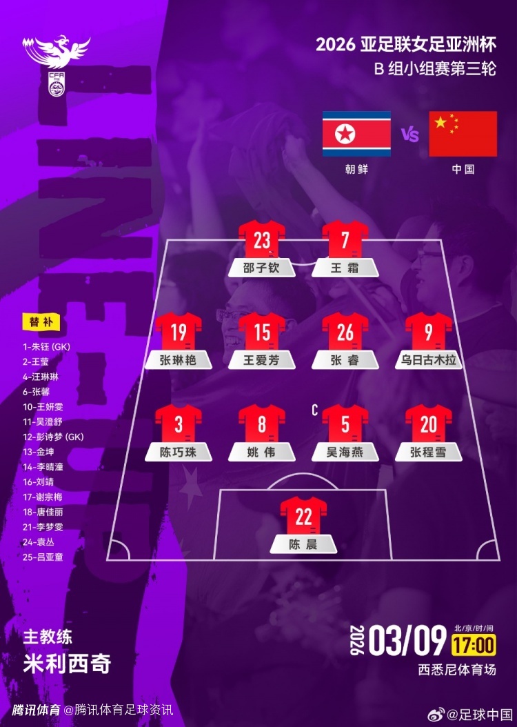2026-03-09 16:20北京时间3月9日,本轮 女足亚洲杯B组第三轮比赛中,中国国家女子足球队将对阵朝鲜国家女子足球队,两队将直接争夺小组第一名。赛前公布的官方站位显示,中国女足本场采用 4-4-2阵型,由邵子钦、王霜搭档锋线。
