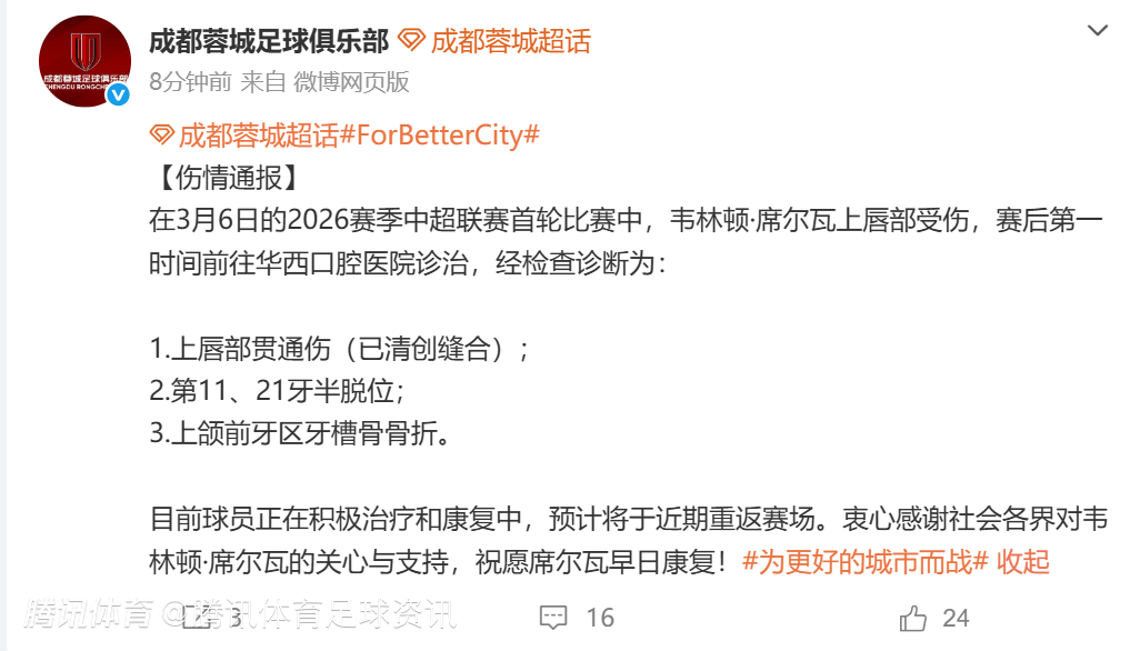 2026-03-09 20:20北京时间3月9日,成都蓉城足球俱乐部 官方发布伤情通报,球队外援韦林顿·席尔瓦在联赛首轮比赛中面部受伤,经检查确认存在上唇贯通伤及牙槽骨骨折等情况,目前正在接受治疗并进行康复。
