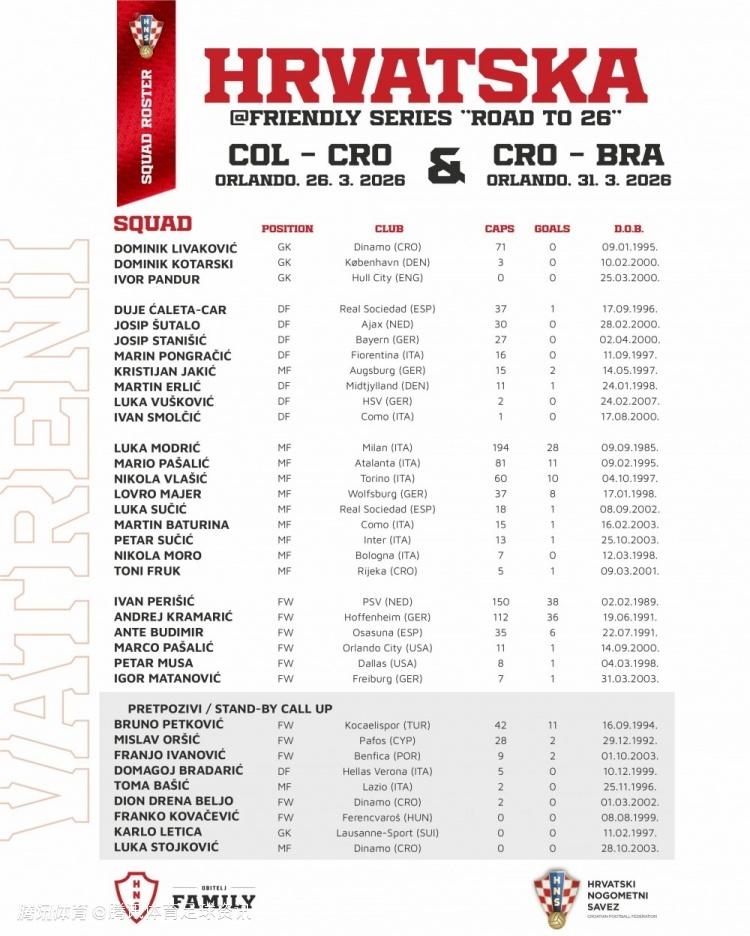 2026-03-09 20:20北京时间3月9日,克罗地亚国家男子足球队 公布了新一期国家队大名单,球队将在3月的国际比赛日进行两场友谊赛,分别对阵 哥伦比亚国家男子足球队 和 巴西国家男子足球队。队长 卢卡·莫德里奇 继续领衔阵容,而 约什科·格瓦迪奥尔 和 马特奥·科瓦契奇 因伤无缘本期名单。