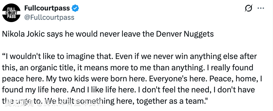 当被问及是否会考虑离开掘金、加盟其他球队时,约基奇表示:“我不愿意去想象那种画面。就算我们之后再也拿不到任何冠军,哪怕只有这座顺其自然拼下来的总冠军,对我来说也比一切都重要。”