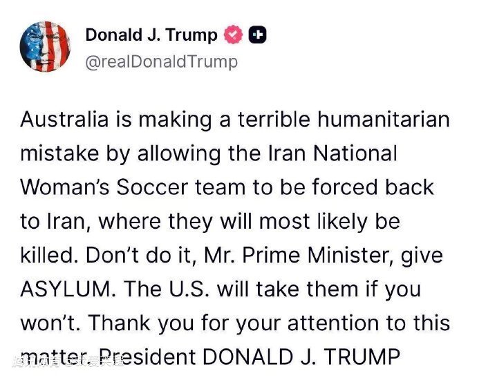 这位美国总统直言:“澳大利亚正在犯下一个可怕的人道主义错误,他们允许伊朗女足被强行送回伊朗,在那里她们极有可能被迫害。”