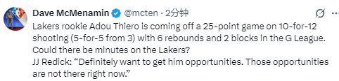 2026-03-10 06:10北京时间3月10日,湖人主帅雷迪克在球队训练结束后接受媒体采访,谈及新秀蒂耶罗能否在湖人队获得出场时间的话题。蒂耶罗近期在发展联盟比赛中表现出色:12投10中(三分5投全中),砍下25分6篮板2盖帽。