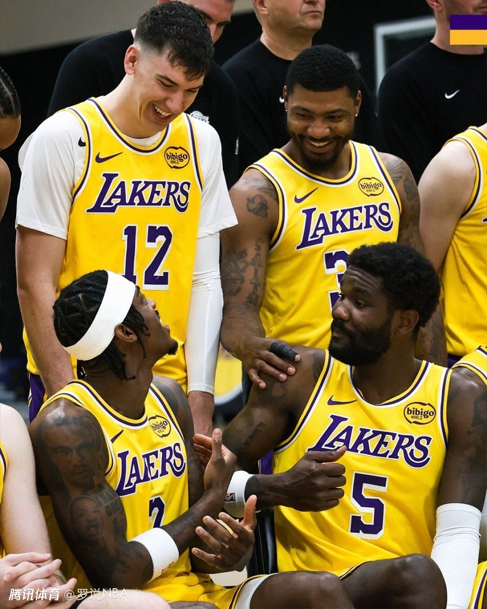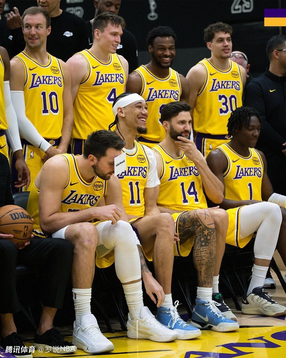 湖人拍摄全家福!东契奇搞怪把名字贴额头 詹姆斯布朗尼笑容满面