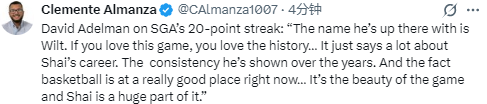 谈到亚历山大连续20+得分纪录,阿德尔曼说道:“他现在已经和威尔特-张伯伦这些传奇名字并列了。如果你热爱篮球、热爱历史,就知道这足以说明亚历山大的职业生涯有多出色。这些年来他展现出的稳定性令人惊叹。现在的篮球氛围非常好,这就是这项运动的魅力,而亚历山大正是其中至关重要的一部分。”