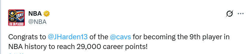 NBA官方也晒图祝贺哈登解锁29000分里程碑。