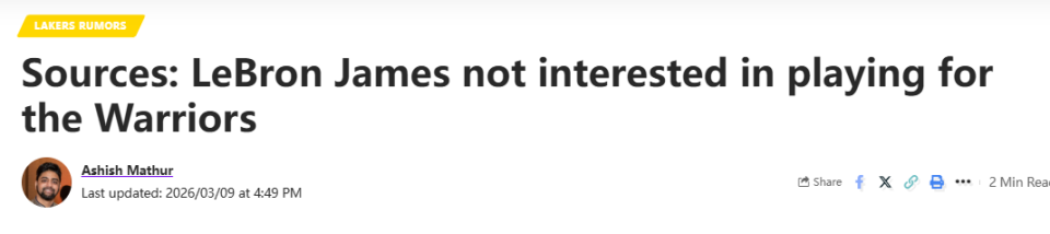 2026-03-10 08:10北京时间3月10日,据Lakers Daily消息源透露:如果勒布朗-詹姆斯今年休赛期不退役,他下赛季无意为金州勇士效力。