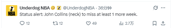 2026-03-10 09:40北京时间3月10日,NBA常规赛继续进行,快船队对阵尼克斯队。赛前,约翰-科林斯参加了快船队的场上训练,但根据多位快船队记者透露,科林斯仍将缺席本周的所有比赛,至少还要1周时间才能复出。