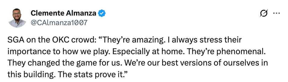 谈及雷霆主场球迷,亚历山大表示:“他们太不可思议了。我一直都在强调,他们对我们的比赛走势有多重要,尤其是在主场。他们堪称现象级,为我们扭转了比赛局势。在这座球馆里,我们能打出最好的自己,数据足以证明这一点。”