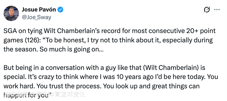 谈及自己连续20+得分场次追平张伯伦一事,亚历山大表示:“我现在还没完全缓过来,这件事实在太震撼了。说实话,我尽量不去想这件事,尤其是在赛季进行期间。当下要操心的事情太多了。但能和张伯伦这样的传奇人物被一同提及,意义非凡。很难想象十年前的我,如今能站在这样的高度。你付出努力,相信过程,抬头时就会发现,美好的事情终会降临。”