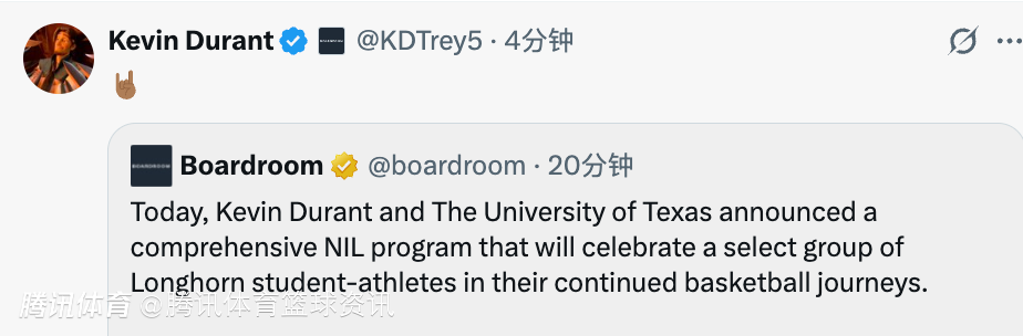 2026-03-10 22:30北京时间3月10日,今天,杜兰特与得克萨斯大学(杜兰特母校)共同宣布推出一项全面的NIL(姓名、形象与肖像权)合作计划,旨在为该校队的精英学生运动员提供支持,助力他们的篮球生涯发展。杜兰特本人也在社媒转发了这一动态。