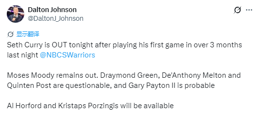 塞斯-库里缺阵。他昨天刚打完三个月多以来的首场比赛。