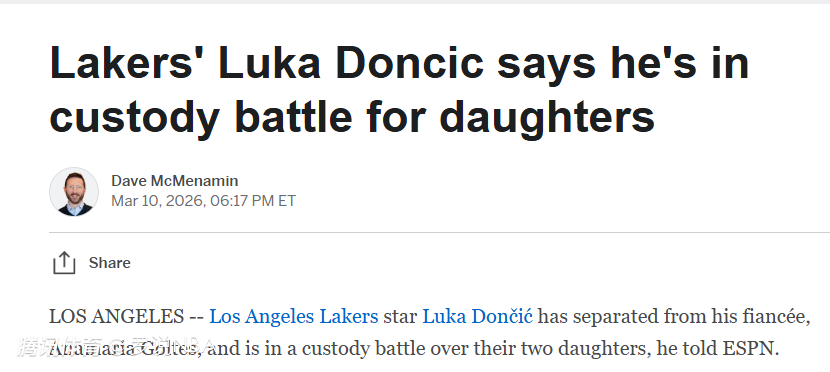 2026-03-11 07:10北京时间3月11日,洛杉矶湖人球星卢卡-东契奇向ESPN证实,他已与未婚妻安娜玛丽亚-戈尔特斯分手,目前正就两人的两个女儿陷入抚养权纠纷。