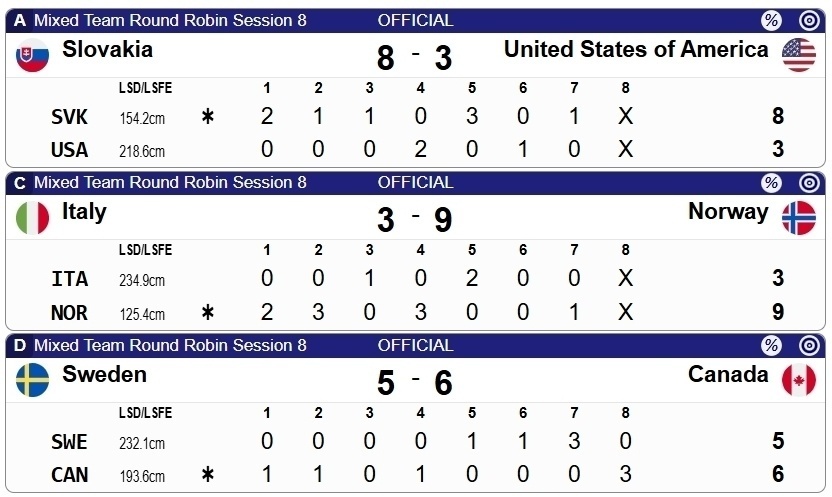 另外三场交手里,斯洛伐克8-3美国、意大利3-9挪威、瑞典5-6加拿大。