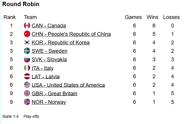 目前全部队伍都完成了6场比赛,加拿大全胜排第一,中国5胜1负位列第二,韩国和瑞典并列第三。