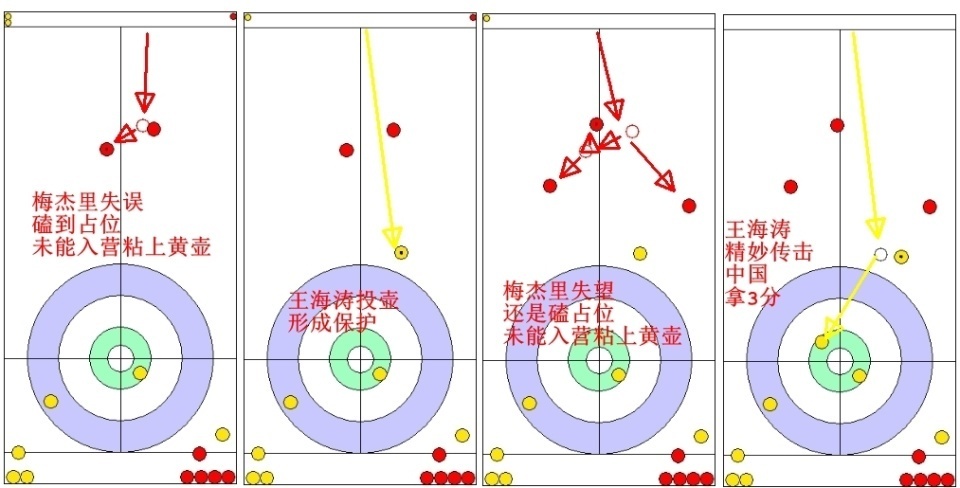 四垒梅杰列两投力量都小了,没能赢过中国黄壶;因为红壶位置有些微妙,王海涛也只能勉强投一颗,中国拿1分。