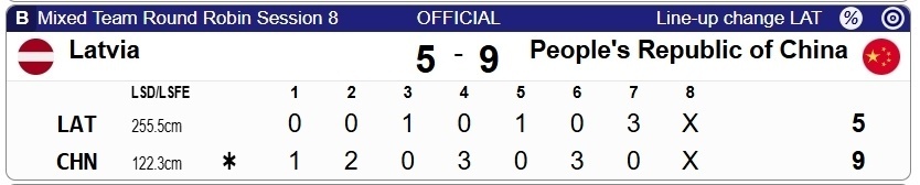 第八局:因为领先4分,中国队严格执行简单局面,凡是对手入营壶,都直接打甩击出,到了总第10投,拉脱维亚炮弹耗尽,比赛自动结束。