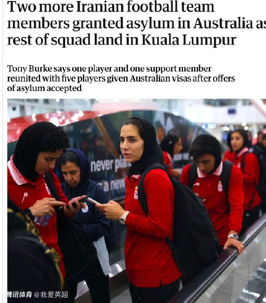 据悉,这两位登机前决定留在澳大利亚的人员,分别是一位伊朗女足球员和一位球队的后勤人员。当晚晚些时候,这两位伊朗女足成员便与5名队友重聚,这5位队友在前一天已作出相同决定。