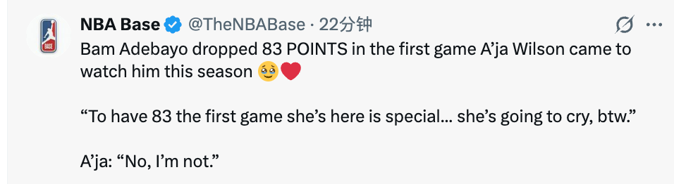 谈及阿贾,阿德巴约表示:“她刚离开一周,之前还抱怨我拿到生涯万分时她不在,让我等她回来。结果她回来的第一场我就砍了83分,这太特别了。我们私下的训练、聊天都特别激励人,看着她的努力,我每天都能得到启发。很庆幸她出现在我的生命里…… 对了,她等会儿肯定要哭。”结果在一旁的阿贾表示:“我才不会哭。”