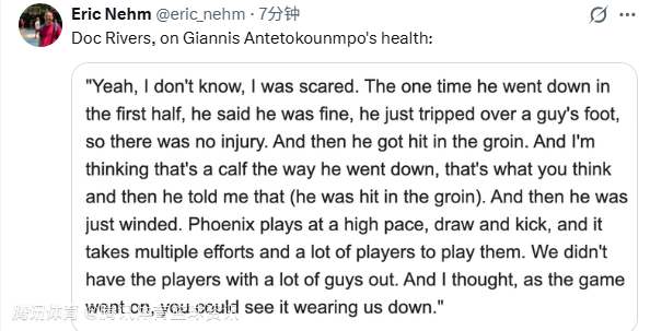 字母哥在比赛中疑似因补篮扭到脚踝,谈到此事时里弗斯表示:“是啊,我也不清楚,当时我还挺担心的。上半场他有一次摔倒,他说自己没事,只是踩到了别人的脚,所以没有受伤。后来他又被打到了腹股沟。看他倒地的样子,我还以为是小腿拉伤了,你第一反应都会这么想。然后他告诉我是被打到腹股沟,之后他就只是有点喘不上气。太阳的比赛节奏非常快,擅长突分,要跟他们抗衡,你得多次拼抢,还需要足够的人员轮换。我们这边很多球员缺阵,人手不够。我觉得随着比赛深入,能明显看出来我们的体能在不断被消耗。”