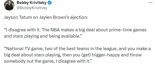 塔图姆也接受了采访,谈到了此事。塔图姆表示:“我不认同这个判罚。NBA一直很强调黄金时段比赛,强调球星要能上场、能打。这是全国直播的比赛,对阵的是联盟里两支最好的球队。你们一边大肆宣传球星出战,一边又判罚过于敏感、轻易就把人罚出去,我不认同这样的做法。”