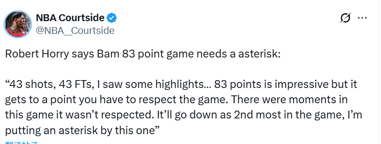 “43次出手,43次罚球。我看了集锦... 83分确实令人惊叹,但比赛到了某个程度,你必须尊重这项运动。这场比赛中有一些时刻并未没有尊重比赛。这会成为历史上单场第二高分,但我会给它加个星号标记。”