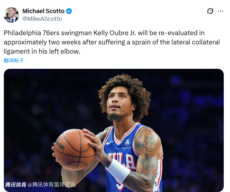 2026-03-12 05:30北京时间3月12日,据记者Brett Siegel报道,76人球员乌布雷因左手肘外侧副韧带扭伤,将在大约两周后接受伤情复查。