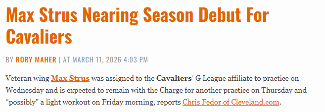 2026-03-12 06:10北京时间3月12日,据骑士队记Chris Fedor报道,斯特鲁斯已被下放至骑士队下属发展联盟球队进行训练,预计他周五将继续随充电人队训练,且“有可能”在周六上午进行轻度训练。