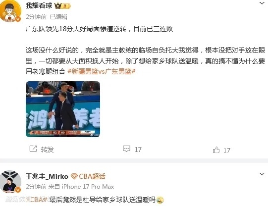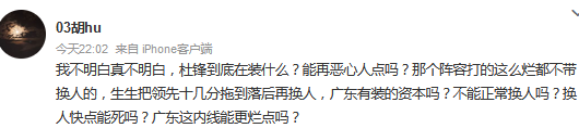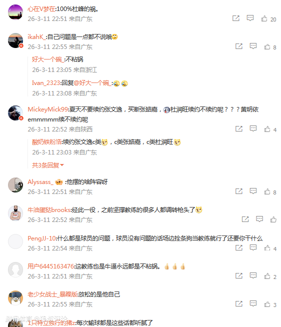 2026-03-12 07:00CBA常规赛第二阶段首战,广东男篮客场领先新疆18分的情况下,遭到对手大逆转引发外界的热议,特别是最后时刻的一些用人,不少球迷和媒体对于杜锋的执教方式提出质疑。