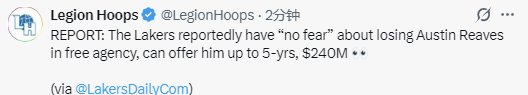 2026-03-12 08:00北京时间3月12日,根据Lakers Daily报道,湖人队计划在今年休赛期,一旦完全自由球员市场开启,就为里夫斯提供一份5年2.4亿美元的合同。