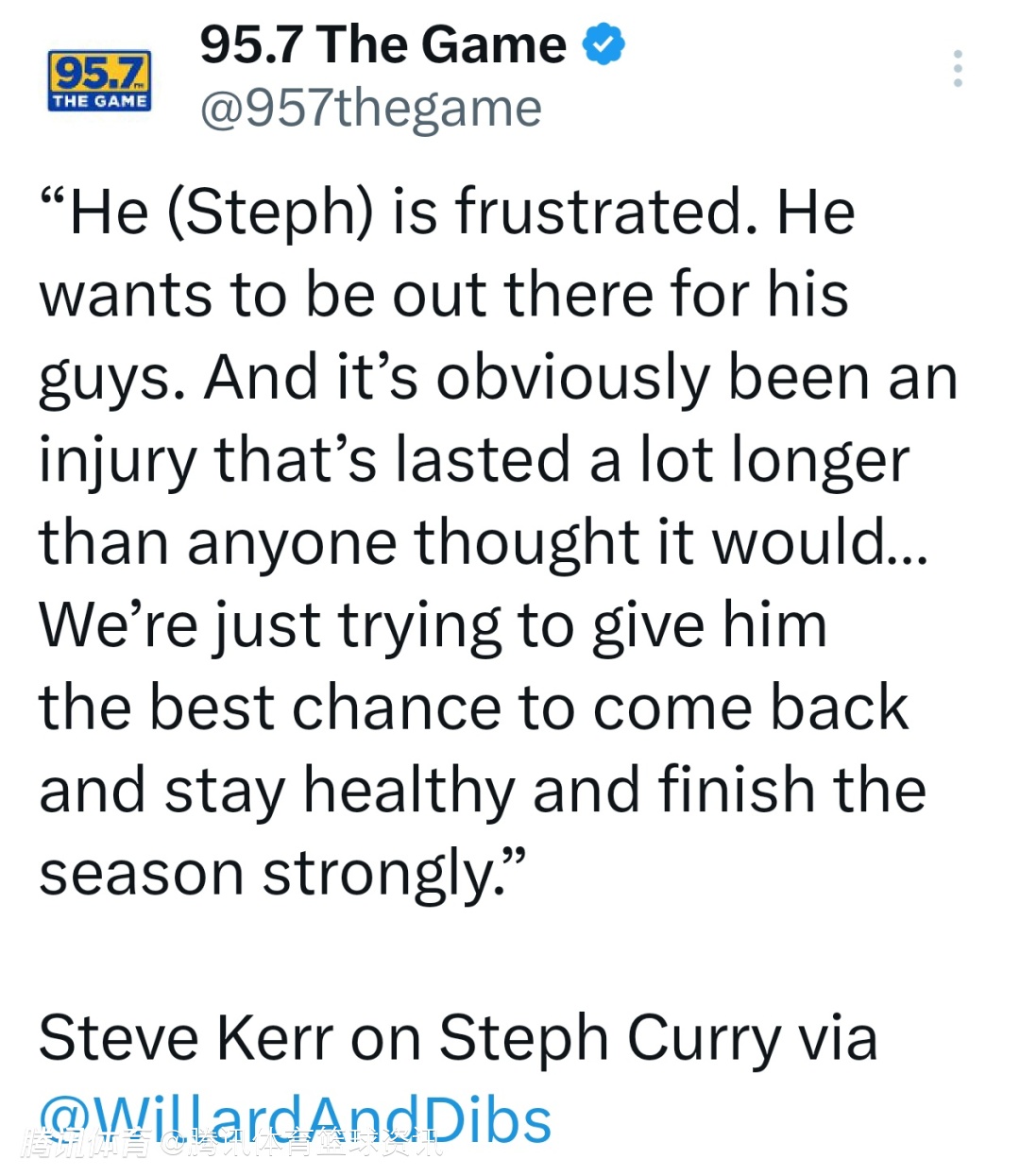 科尔表示:“他(库里)很沮丧,他渴望为队友们上场。这次的伤病显然比所有人预期的要持久得多……我们只是想给他最好的康复条件,让他能够回归并保持健康,强势打完这个赛季。”