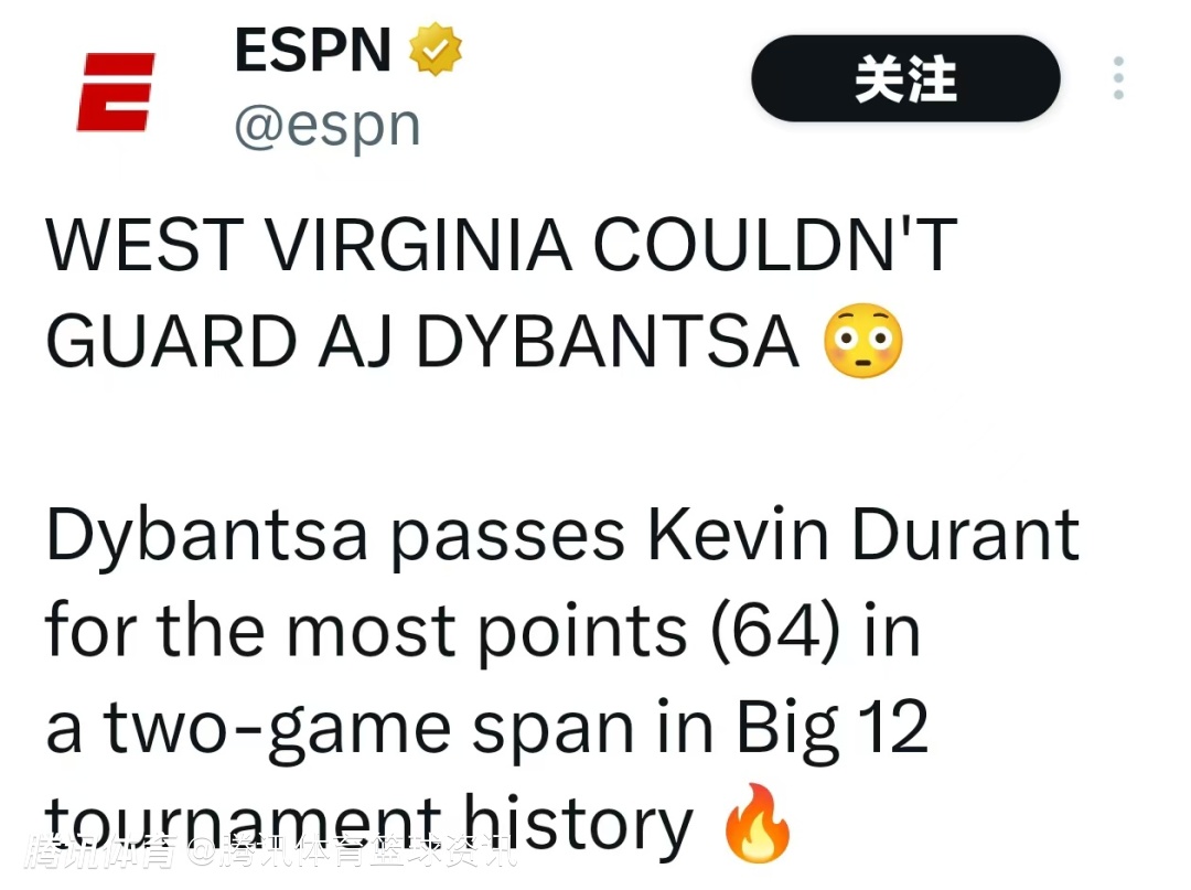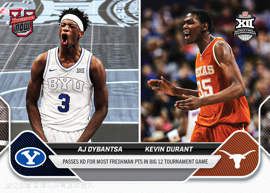 根据数据统计显示,迪班萨就此以两场轰下67分的表现,超越杜兰特(64分),成为大12联盟锦标赛历史上背靠背得分最多的球员。此前,杨百翰大学以105-91击败堪萨斯州立大学,迪班萨状态火热,出战37分钟,21投15中,三分球6投2中,罚球9投8中,狂砍40分9篮板6助攻3抢断带领球队取得胜利。迪班萨当场40分打破了杜兰特保持的大12联盟锦标赛大一新生单场得分纪录(37分),还成为大12联盟锦标赛历史上首位单场至少拿下35分5助攻的球员。