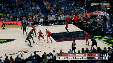 第一节还剩11分23秒时,锡安突破上篮命中为鹈鹕先得分,随后还剩10分27秒时奎克利突破上篮命中,猛龙首次得分追成2:2。