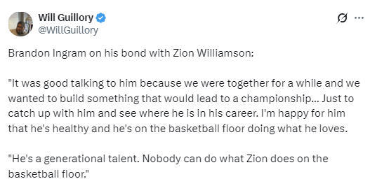 在谈到与前队友锡安之间的感情时,英格拉姆表示:“和锡安聊天感觉很好,我们一起并肩作战过一段时间,都希望能一起打造一支有能力冲击总冠军的队伍。我只是想和他叙叙旧,看看他职业生涯现阶段的状况。我为他感到开心,他保持着健康,回到了球场上,做着自己热爱的事。他拥有一代人一遇的天赋,在篮球场上,没人能做到锡安能做到的事。”