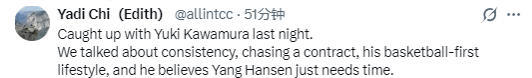 “你知道,作为一名亚洲球员在这里打球,我感到非常自豪。我真的很自豪。而且说实话,我也为杨瀚森感到骄傲。就像我说的,他才20岁,但他每天都在尽自己最大的努力。我不完全确定,但从我看到的情况来看,他确实是在努力。”