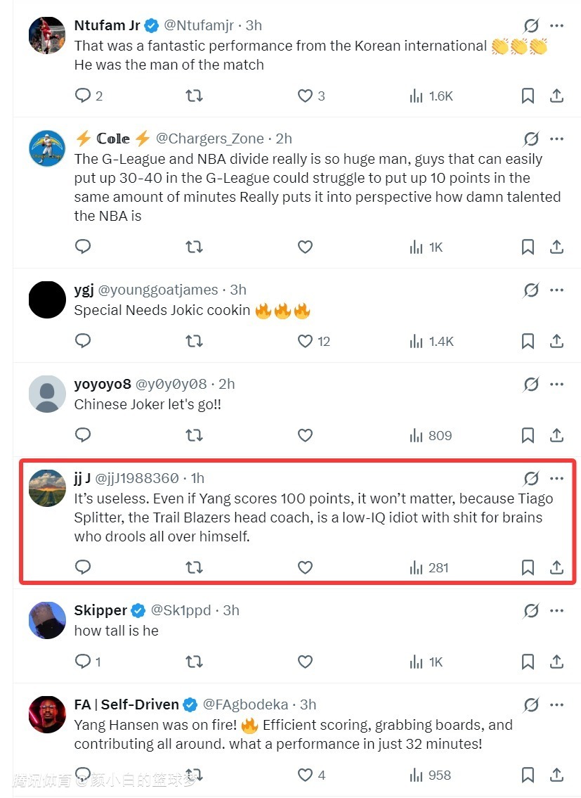 但有一位开拓者球迷写道:没用的,就算杨瀚森在G联赛拿到100分也没用,因为开拓者主帅斯普利特是一个低智商、愚蠢的主帅,他不会给杨瀚森机会的。