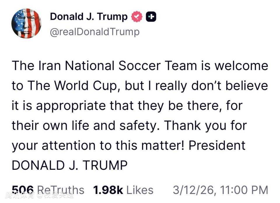 2026-03-12 23:50北京时间3月12日,在距离世界杯开幕仅剩90天时,美国总统特朗普在社媒发文,发表了自己对伊朗男足国家队参加美加墨世界杯的看法。