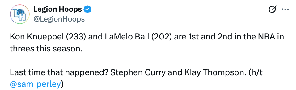 而上一次出现这种三分球命中数为联盟前二都是同队队友的情况,还是当初的水花兄弟(库里和克莱曾在14-17年达成过)。