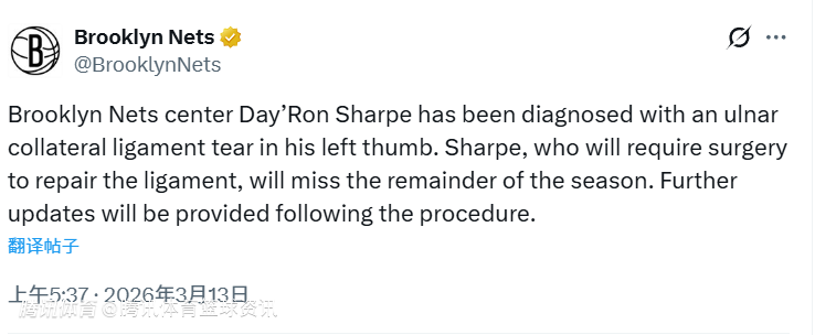 2026-03-13 06:10北京时间3月13日,篮网官方发布公告,宣布球队中锋戴罗恩-夏普被确诊为左手拇指尺侧副韧带撕裂。他需要接受韧带修复手术,并将缺席本赛季剩余所有比赛。术后将发布进一步的伤情更新。