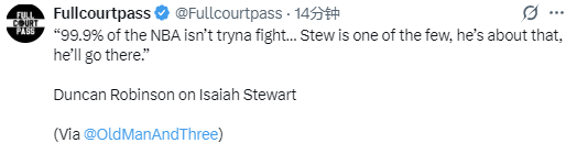 “说实话,我合作过很多队友,NBA里99.9%的球员都不想打架,斯图尔特是少数真的敢硬刚、不怕冲突的人,我们都有目共睹。大多数时候场上的争执都只是摆姿态、装样子,做做样子就结束了。我见多了这种场面,有人推搡、喷垃圾话,队友和教练上来拉开,事情就了结了,只是这次冲突闹得更严重一些。我真不觉得大多数球员是真想打架。”