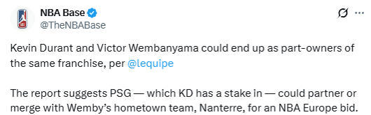 杜兰特要成赢家!大巴黎或与文班家乡球队合作 共同参与NBA欧洲联赛竞标
