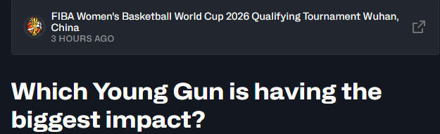 FIBA官网写道:“赛程已过两场,还有三场较量即将到来,赛事中不少年轻球员已经惊艳亮相。从法国球员多米尼克-马隆加的惊艳表现与扣篮,到澳大利亚选手伊莎贝尔-博莱斯开局状态火热,再到中国内线高塔张子宇的出色发挥,以及德国球员弗里达-布纳的上佳状态,赛场中还有诸多精彩表现值得关注。”FIBA官网还号召球迷们进行投票,评选出心目中最具影响力的年轻球员。