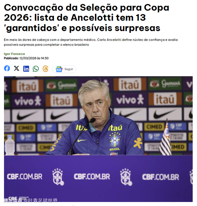 2026-03-13 09:20还有3个月,2026年世界杯就将开打。3月13日,巴西媒体estado透露,巴西国家队主帅安切洛蒂,将18名球员列入世界杯参赛名单中。还有8个名额,安切洛蒂将继续考察。内马尔不在“准入名单”之列,世界杯前景并不明朗。