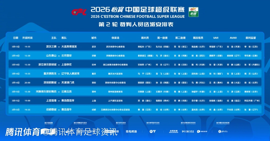 2026-03-13 10:30北京时间3月13日,中国足球协会超级联赛第2轮裁判安排正式公布。其中,焦点战山东泰山对阵北京国安将由麦麦提江担任主裁判,VAR为唐顺齐。本场比赛将于3月14日15:30进行。此外,升班马对决重庆铜梁龙对阵辽宁铁人的比赛,将由马宁担任主裁判。