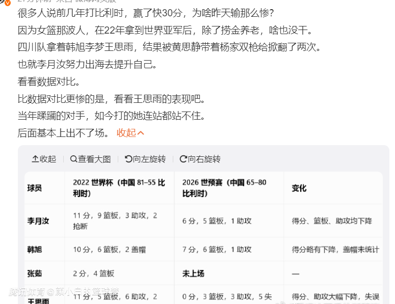 随着当年那一代女篮核心班底的年龄增长,新一代阵容中没有一个出色的控球后卫,中国女篮的四大中锋有三个未能展现风采,张子宇一人20+11实属杯水车薪,最关键的是张子宇只要登场对手的三分就能不断命中,她移动实在是太慢。